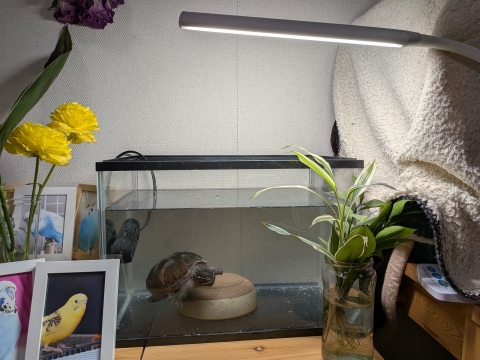 かめランドの大人組(クサガメ組)は毎晩21時になるとライトを消して毛布を被せますが、結愛ちゃんは21時...